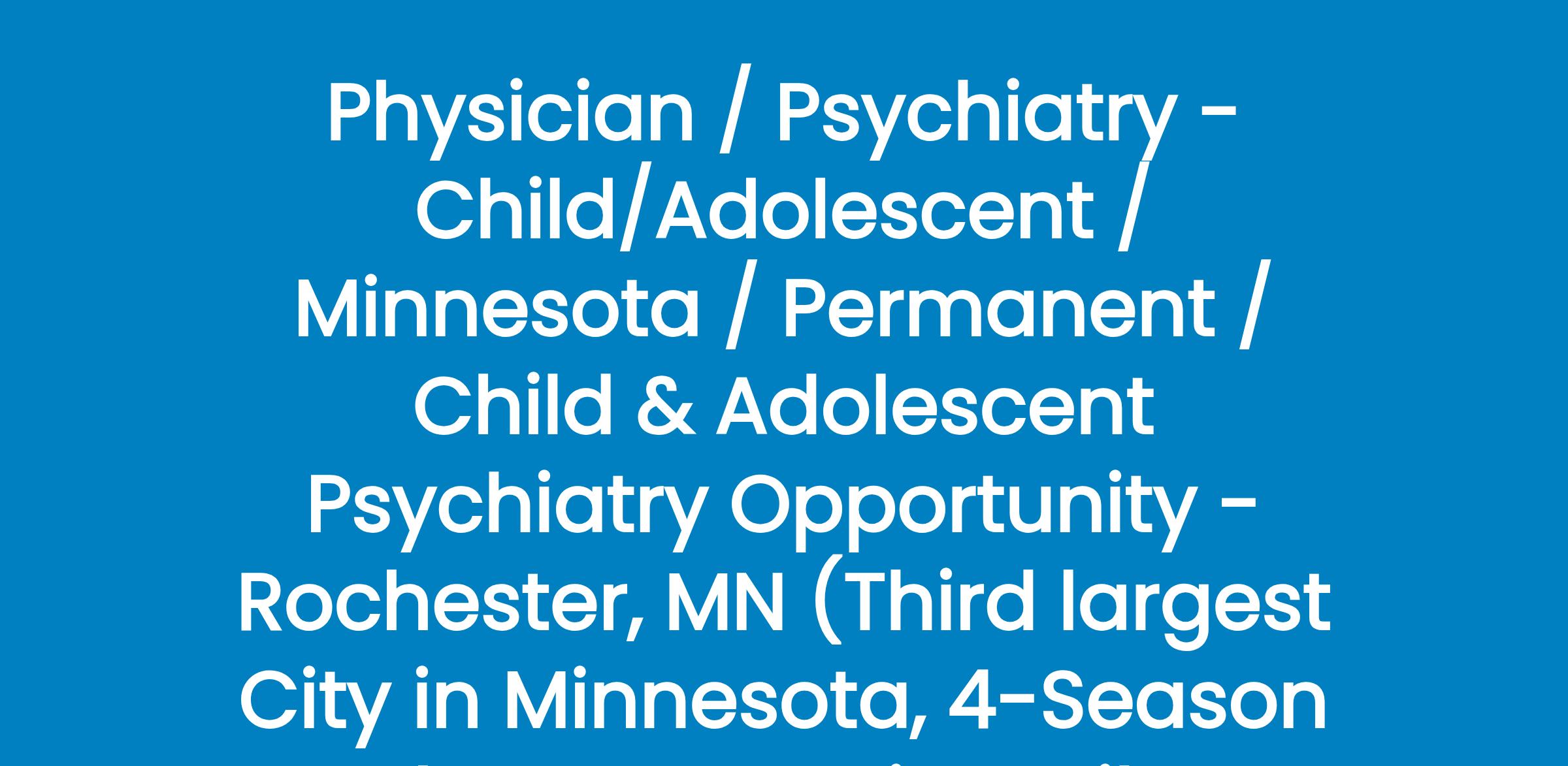 Olmsted Medical Center has a BE/BC O/P Child & Adolescent Psychiatrist opportunity for you to join our multi-specialty team in Rochester, MN. This is a fulltime position that offers excellent salary and benefits. We use a state of the art electronic medical record - Epic.About Olmsted Medical Center:Olmsted Medical Center (OMC), a 501(c)3 non-profit organization, has been southeastern Minnesotas hometown healthcare provider since 1949. OMCs 186 clinicians join over 1,300 other healthcare professionals serving at over 22 locations, including two multi-specialty clinics, a Level IV trauma hospital with 24-hour emergency room, a Skyway Clinic in downtown Rochester, and 11 community branch clinics. OMC also offers walk-in FastCare and Acute Care clinics.One adult psychiatrist, seven psychologists, including one child psychologist, and two psychiatric nurse practitionersCollegial, clinic-based environmentIntegrated modelPractitioners are assisted in their duties by dedicated nursing and support staffMinimal Call (1:10)About Rochester:Rochester, the third largest city in Minnesota, is a vibrant, diverse, and professional community that offers many opportunities for residents. There are a variety of sports and recreational activities as well as over 60 miles paved trails for biking and hiking. The city includes more than 100 parks, 9 public golf courses, a nature center, a small zoo, a library, a convention center, a childrens museum, a summer collegiate baseball team, and many, many restaurants, bars, pubs, breweries, and coffee shops. In addition, there are is an active and popular arts, music, and theater scene. Olmsted County of which Rochester is the county seat, is known for its outstanding educational opportunities. Within the county you will find 56 public and private elementary, middle, and high schools. In addition to traditional schools, Rochester offers magnet and charter schools.If you would like to learn more about this opportunity reach out to me at:Van