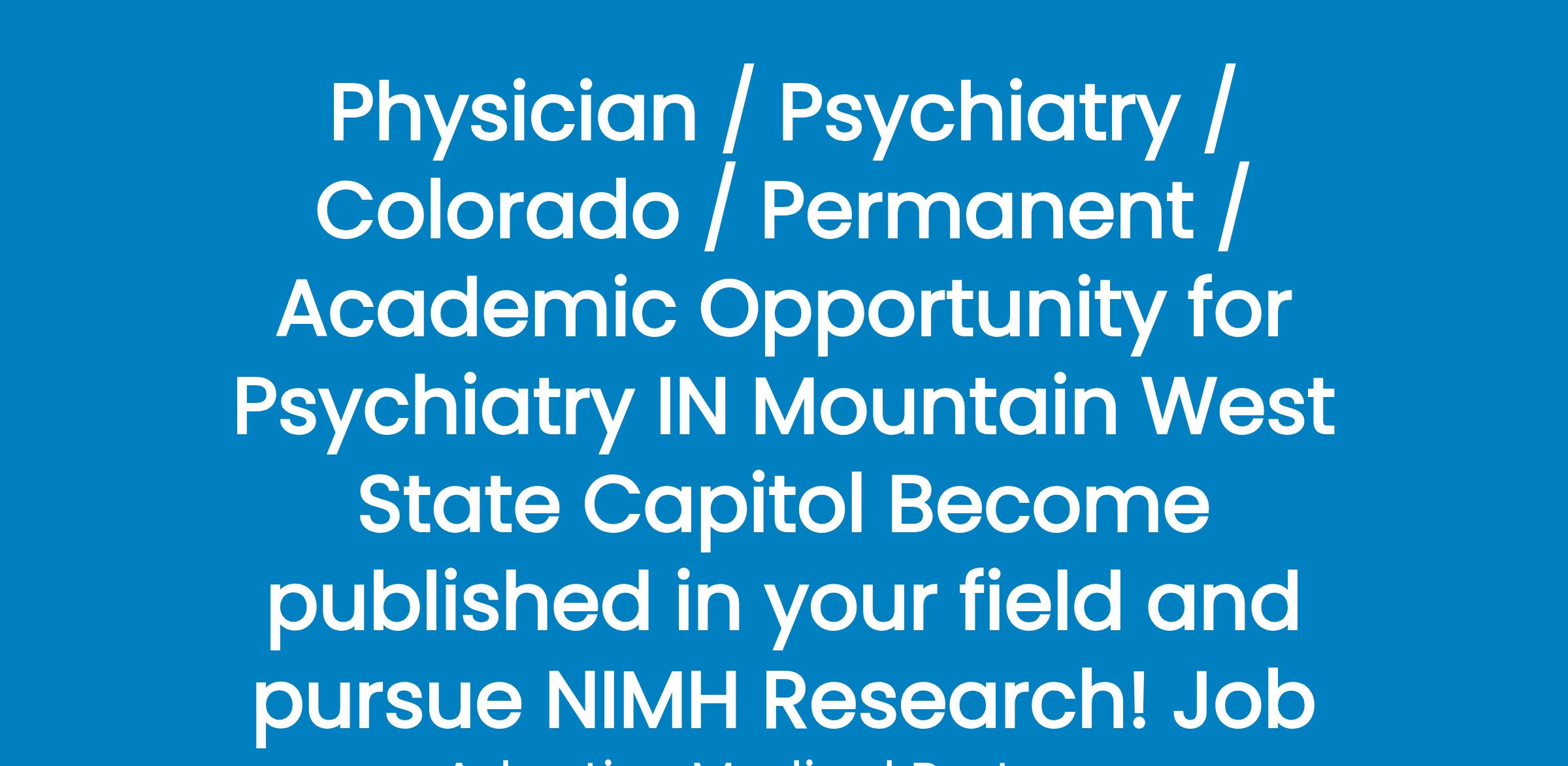 Center for Excellence in need of a Psychiatrist interested in making a difference for our specific patient base.Enjoy a fun work environment and only see 10 patients per day on averagethis is NOT a typical or traditional Psychiatry position.NO call and NO weekends required. Our Hospitalists take all call for our Unit5:1 Nursing ratio for our Providers along with the support of 5 Dieticians, 4 Psychologists, 3 LCSWs that handle all patient dispositions, and a plethora of additional support staffUnique Perks: Employed opportunity with annual base salary above 50th, Loan repayment, Tuition Reimbursement for pursuing your Masters or PhD, full health benefits, 27 days PTO, etc.Major Metropolitan City Service area over 3 Million!FINALLY, a permanent position not located in a small or medium size cityYou will appreciate this downtown location that has an International Airport within 25 minutes!Looking to hike a 14er? Big fan of National Parks? Maybe youre more of a downhill skierregardless if youre a homebody or avid outdoors person, this location has.it.all.Confidentiality is required on my part, hence I cannot simply put our location, but hopefully my hints intrigue you enough to learn more. Ill gladly tell you the quick who and where when you call. This position cannot sponsor visas, but we are more than open to new grads as well as experienced providersPlease contact Lane Willhite at or email me at Reference Job 1447