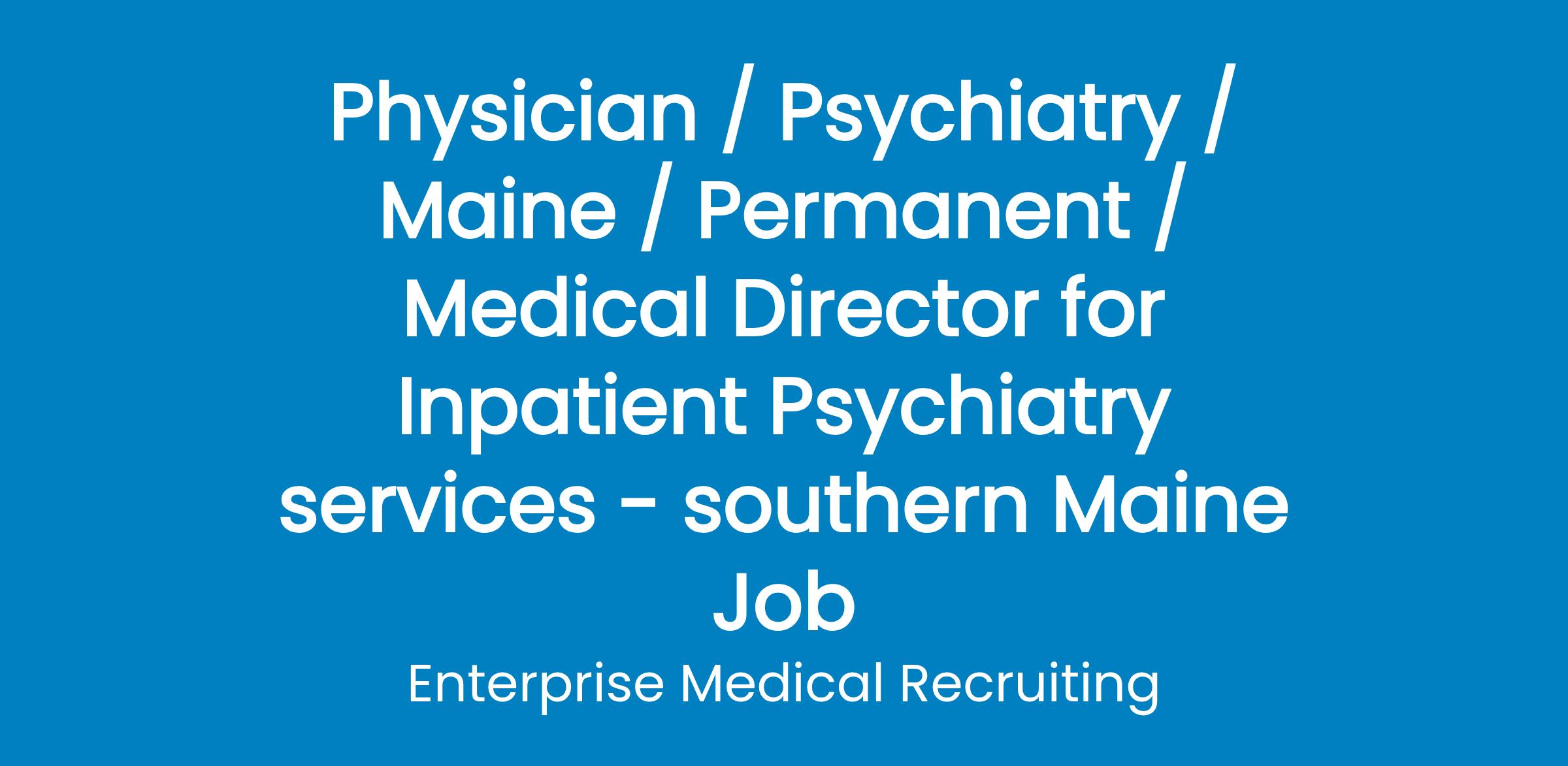 A lead interdisciplinary team of Psychiatrists and Advanced Practice Providers has an opening for a Psychiatry physician to work 50% clinical and 50% administrative in southern Maine. They are part of a large non-profit integrative health system with over 19,000 employees.