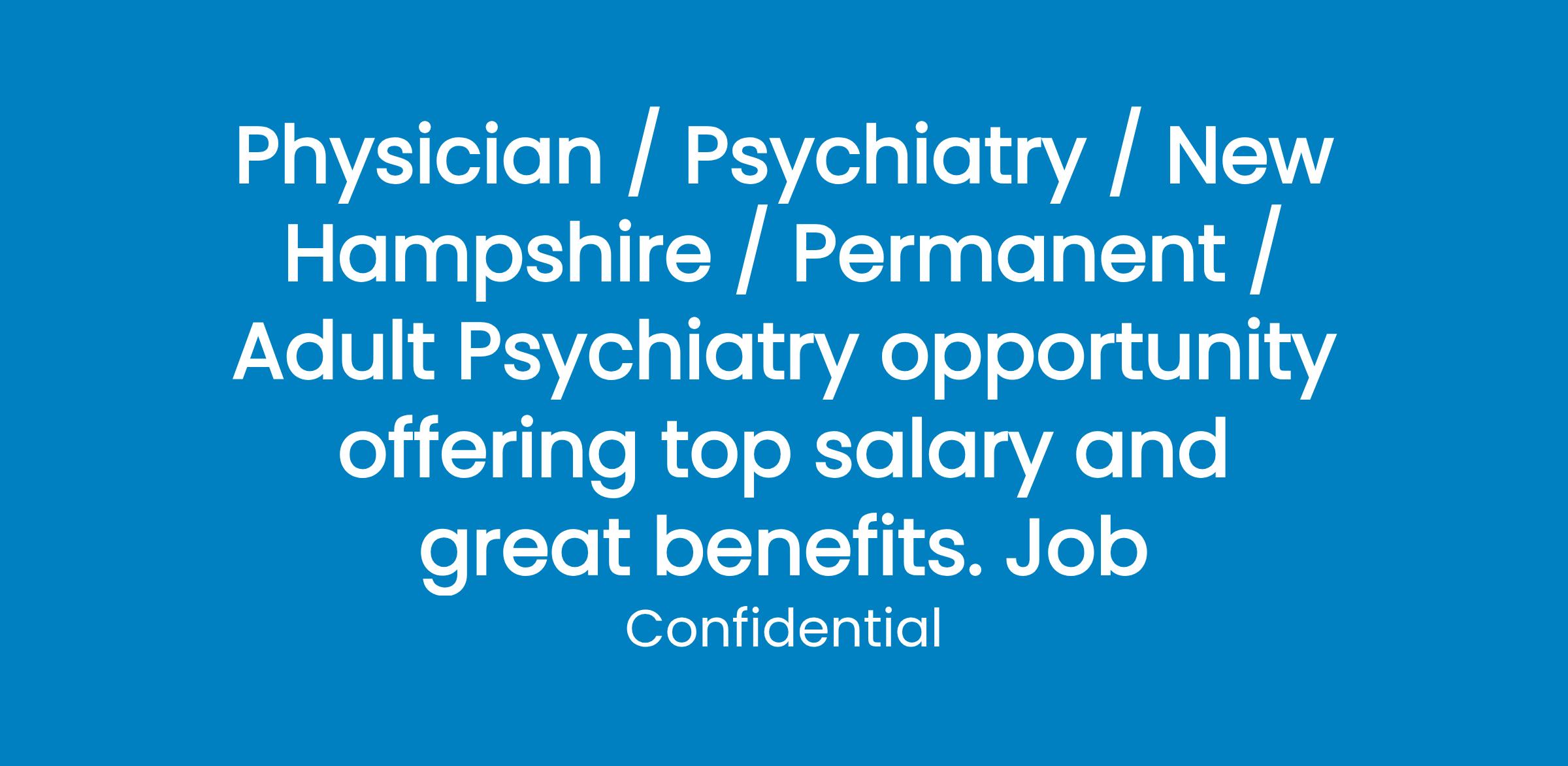 One of the largest providers of behavioral health services in New Hampshire seeks a Psychiatrist to join their staff. 100% outpatient position offering a salary up to $240,000. Qualified candidates will be offered the title of Associate Medical Director. Benefits include substantial paid time off starting with 4 weeks and increasing with longevity, health insurance with minimal co-payment and dental insurance covered 100%. Located in Manchester, a bustling urban center in southern New Hampshire, the area offers all the amenities of a large city and the quaint charm of a New England town.