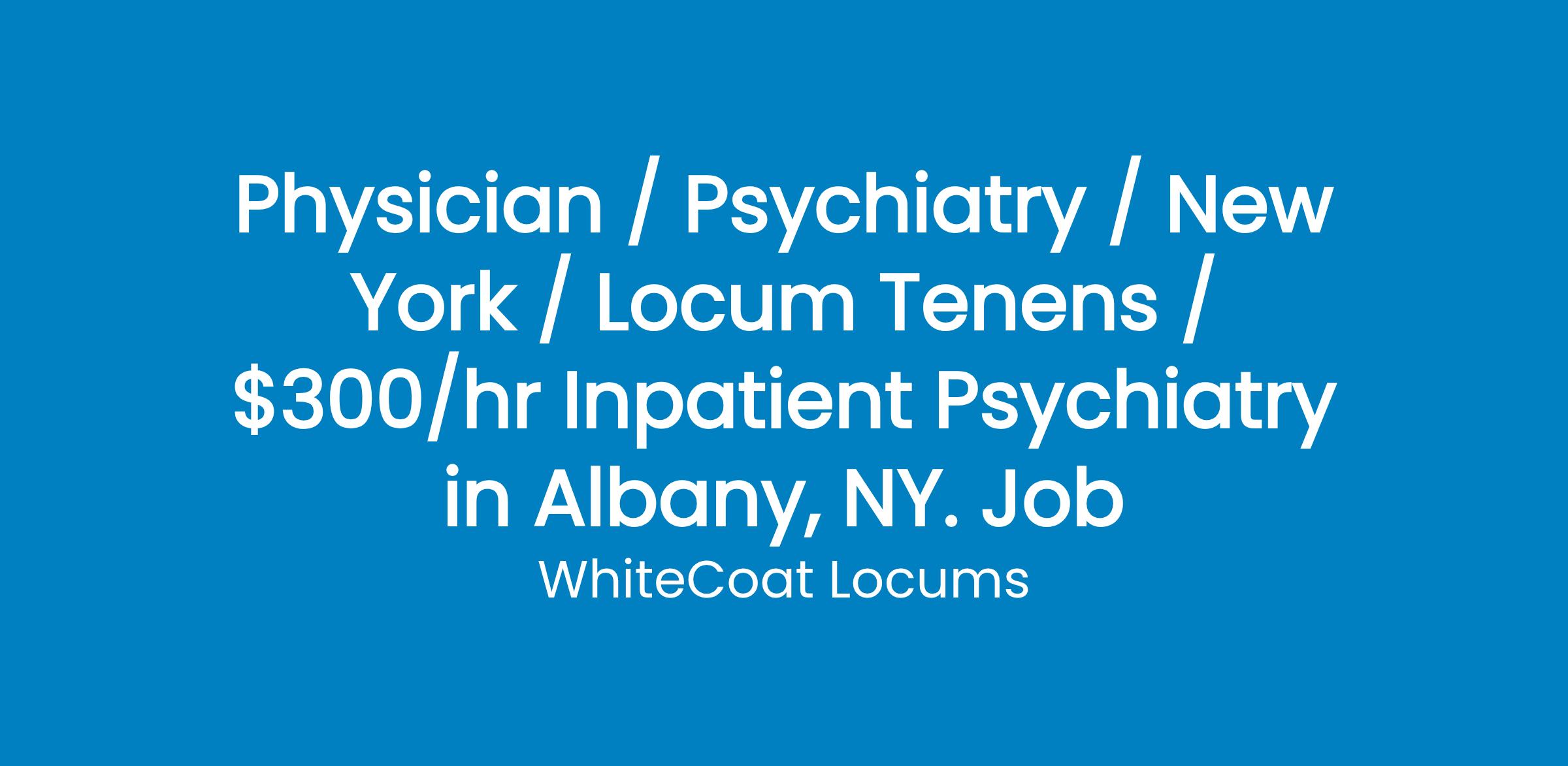 A hospital in New York is seeking Board Certified Psychiatrists for full-time locum tenens coverage on its Adult Inpatient Behavioral Health Unit. Coverage is needed for two open positions, with an ASAP start once credentialed. This is a well-supported inpatient environment with strong safety measures in place.Compensation: $300/hrPosition Details Specialty: Psychiatry Practice Setting: Adult Inpatient Behavioral Health Unit Coverage Start: ASAP (once credentialed) Coverage Type: Full-time locum tenens Number of Openings: 2Schedule and Call MondayFriday, 8:00 AM 4:30 PM Call rotation: 1:4Practice Environment Adult inpatient unit consists of 30 beds split between two physicians (approximately 15 patients per provider per day). Total behavioral health beds: 63Inpatient staffing includes 3 full-time inpatient psychiatrists plus 2 locum openings. Outpatient services (at full staffing) include 5 physicians and 1 APP.The psychiatrist may only encounter pediatric patients when on weekend call in the crisis unit; these patients are evaluated and transferred to an adolescent facility if admitted.Documentation and Support EMR system: Epic 24/7 security guards onsite All staff participate in code responseCredentialing Credentialing timeline: ASAPRequirements Board Certified in Psychiatry required Active New York medical license at time of submission required ACLS certification required Full-time availability is strongly preferred Clean background required due to expedited credentialing requiredAbout WhiteCoat Locums:- Physician owned and led agency- Highest-Pay rates on the market- $1m/3m malpractice insurance and tail- 100% transparency