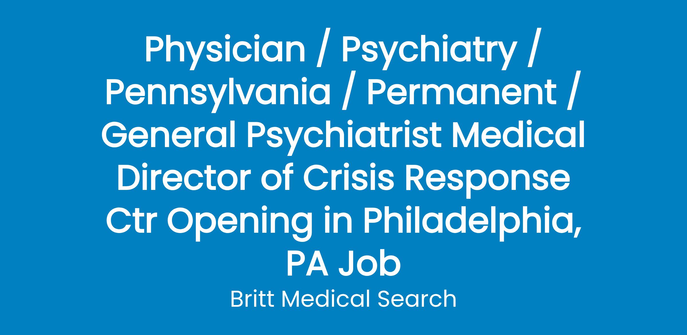 Hospital in Philadelphia, PA is seeking a board certified psychiatrist to lead a Crisis Response Center (CRC) in the role of Medical Director. The CRC provides assessments, treatments and referrals for adults 24/7. The new associate will work with a cohesive multidisciplinary team of behavioral healthcare professionals comprised of psychiatrists, registered nurses, masters-prepared counselors and mental health technicians who serve as an access point for individuals and their families who may be in crisis and are seeking help. The position offers flexibility with minimal call requirements by phone only. Psychiatric ER and triage experience is preferred.