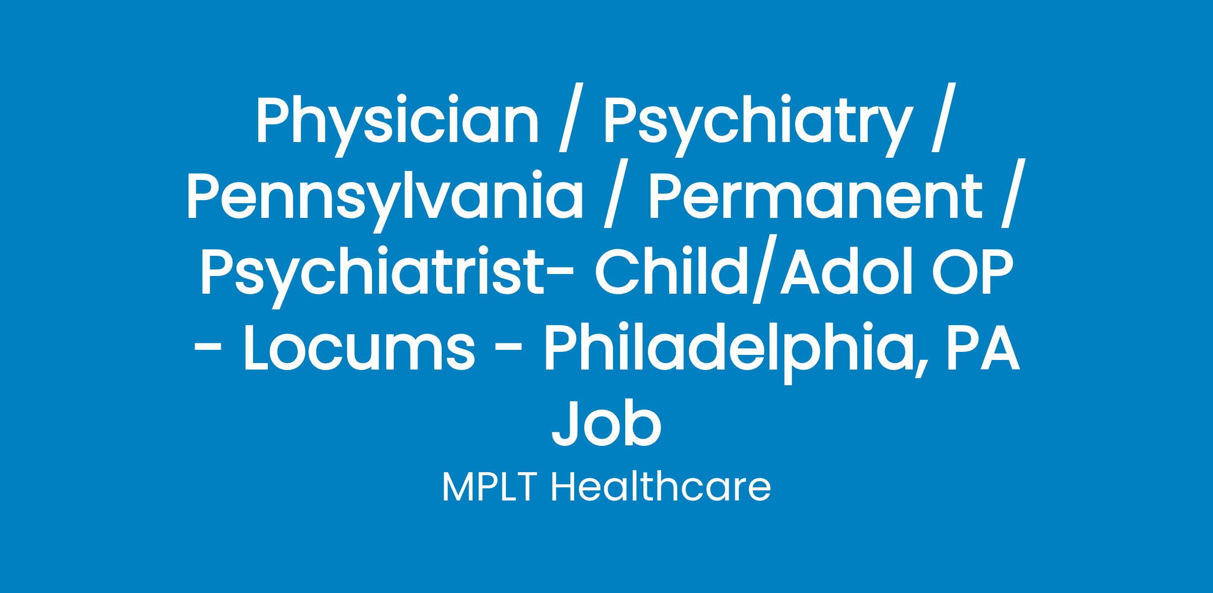 MPLT Healthcare is looking for physicians who Understand the Urgency, Never Give Up, and Have the Courage to Excel in the forever changing medical industry! We have numerous opportunities for an experienced Child/Adolescence Psychiatrists w ith highly competitive pay rates in Philadelphia, PA .