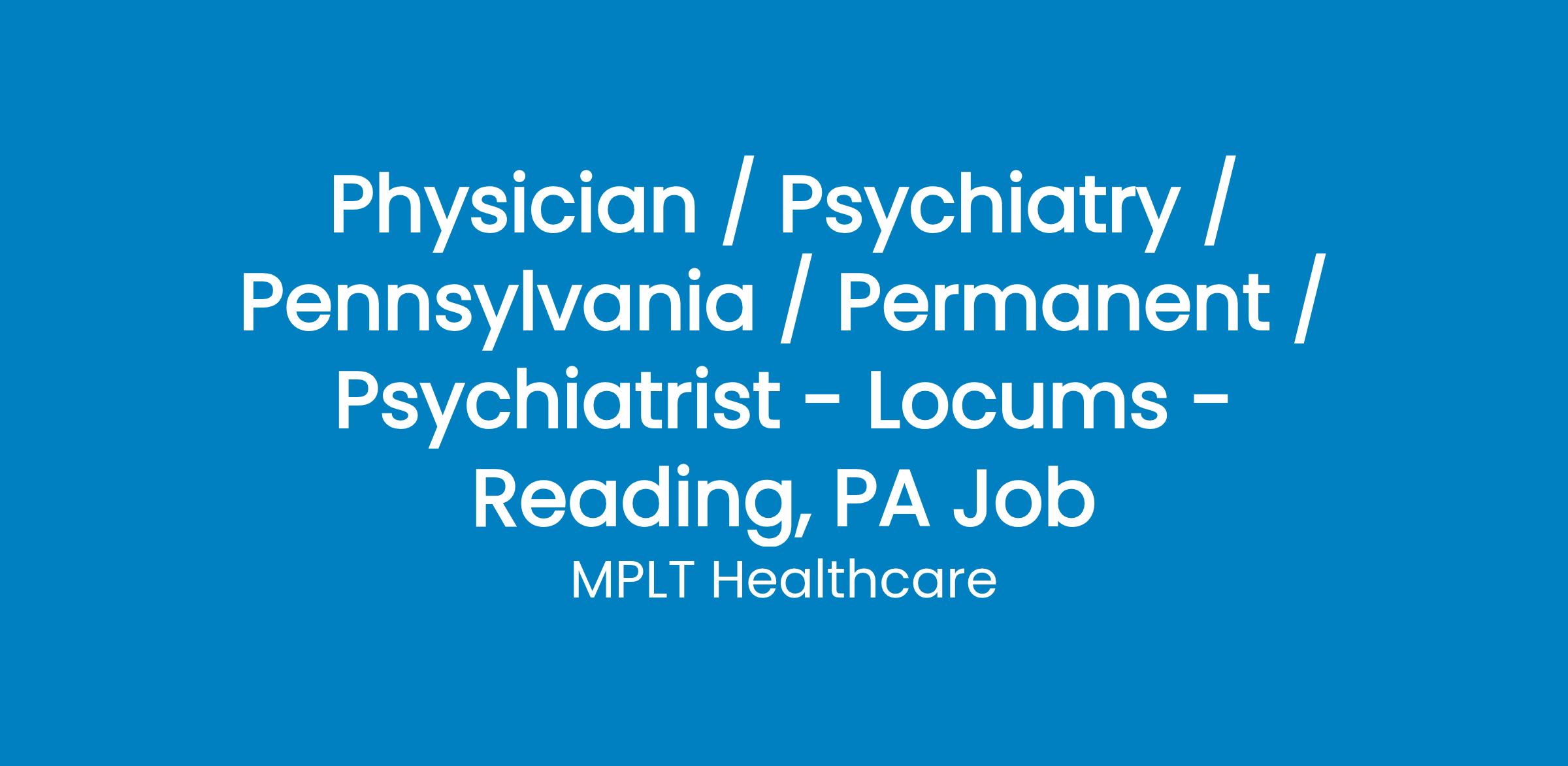 MPLT Healthcare is looking for physicians who Understand the Urgency, Never Give Up, and Have the Courage to Excel in the forever changing medical industry! We have numerous opportunities for an experienced Psychiatrist with highly competitive pay rates in Reading, PA.