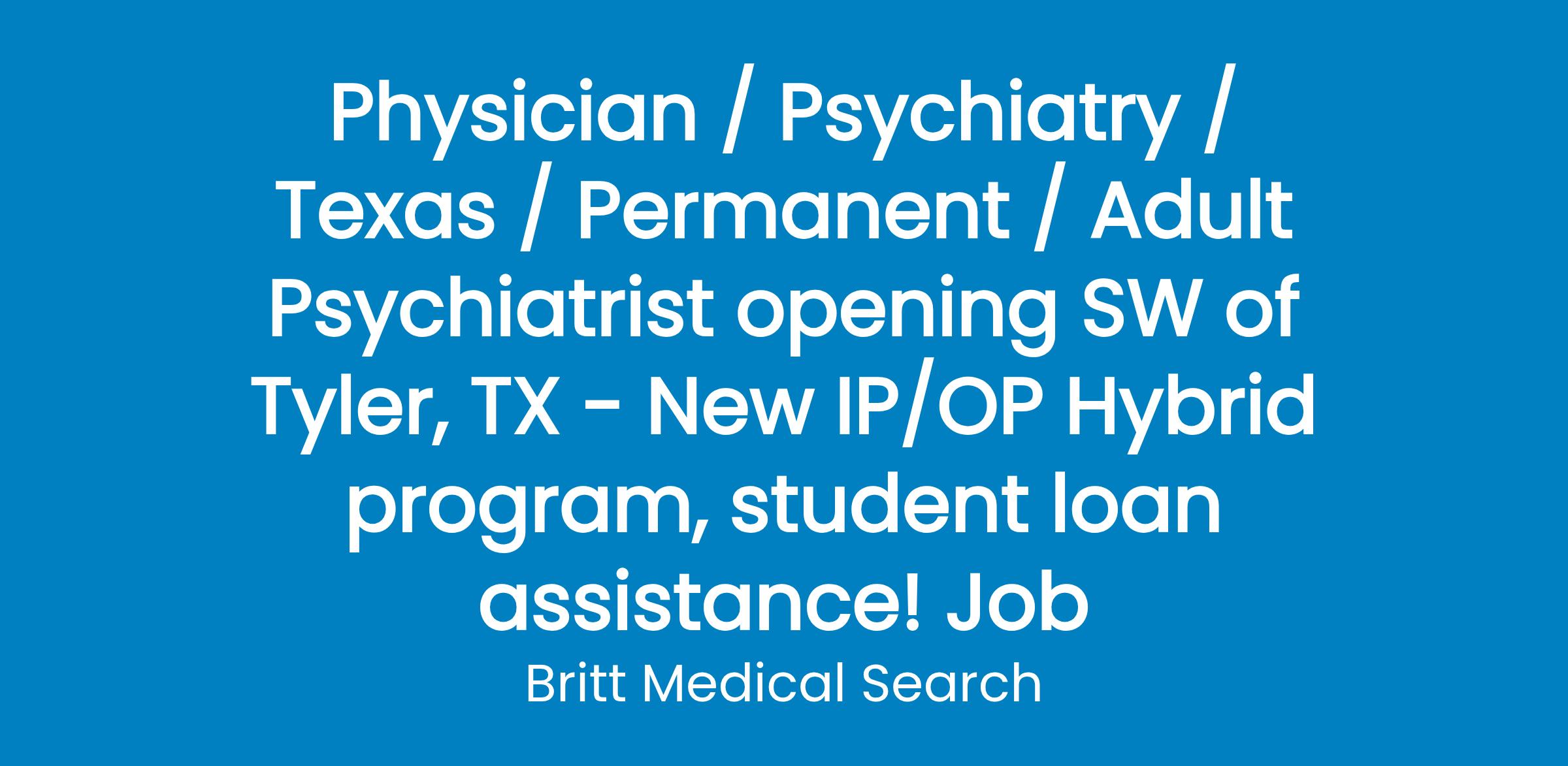 Medical center is seeking a full-time BE/BC Adult Psychiatrist to join their new practice southwest of Tyler, Texas.