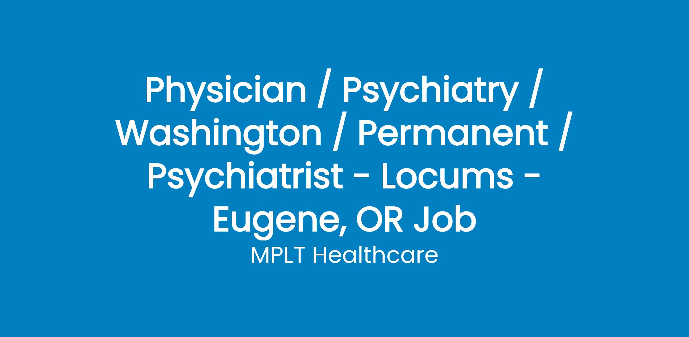 MPLT Healthcare is looking for physicians who Understand the Urgency, Never Give Up, and Have the Courage to Excel in the forever changing medical industry! We have numerous opportunities for an experienced Psychiatrist with highly competitive pay rates in Eugene, OR.