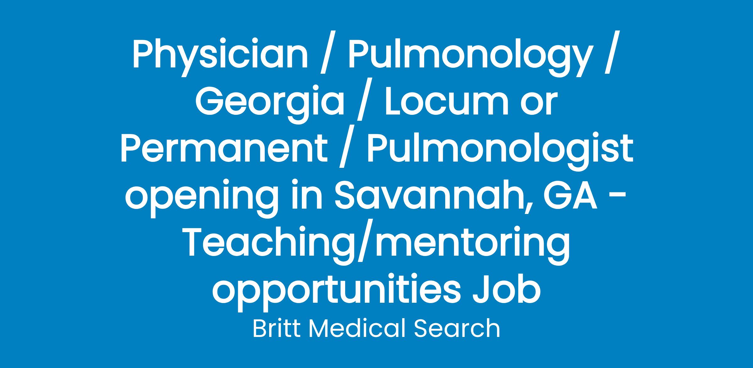 Medical Center is seeking a BC/BE Pulmonologist to join their well-established practice in Savannah, GA.