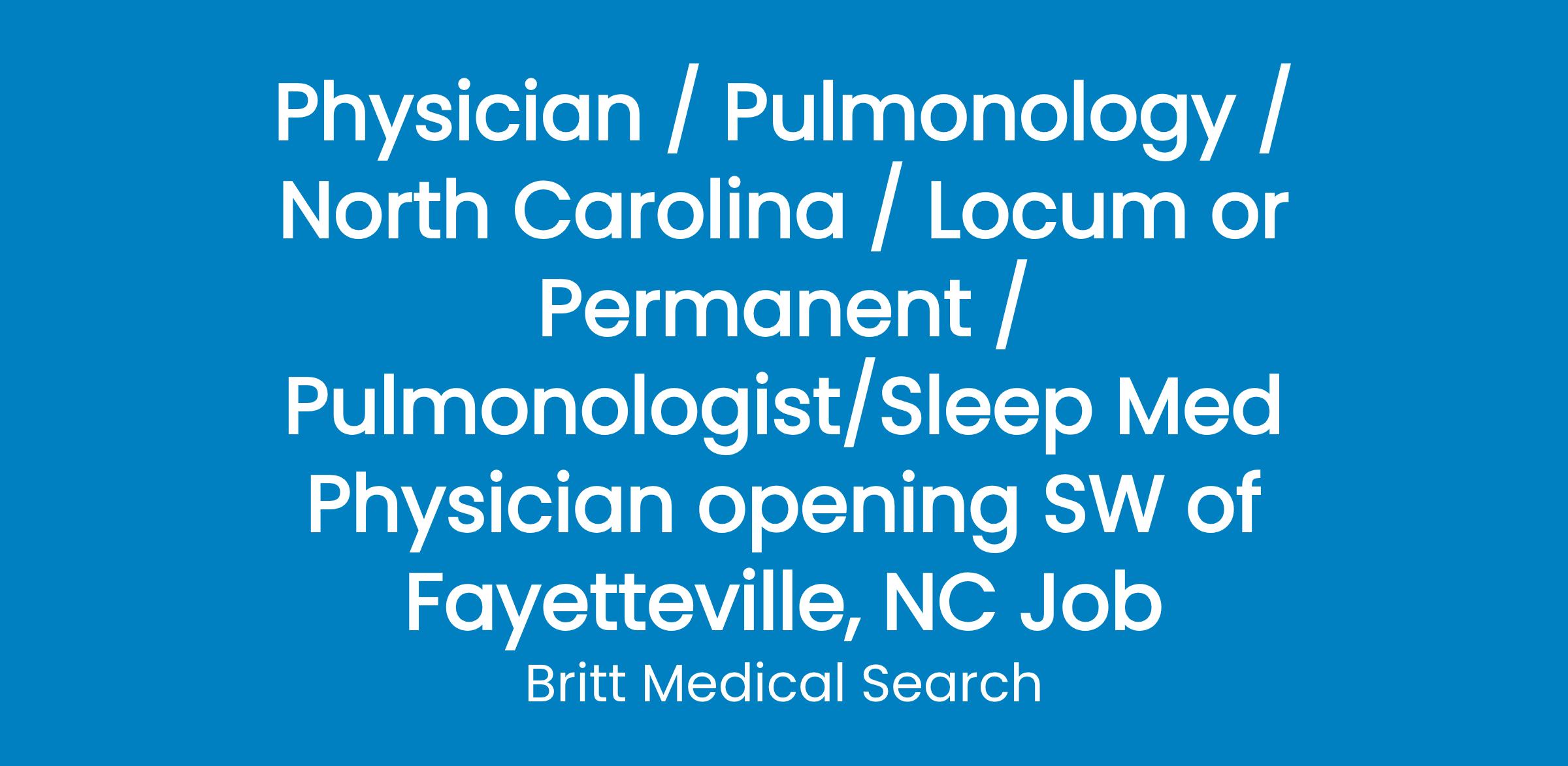Join fantastic Pulm/Sleep Physician in Pulmonology position near golf resort of Pinehurst, NC. Opportunity for outpatient based position with procedures and optional sleep medicine. Reasonable shared call.