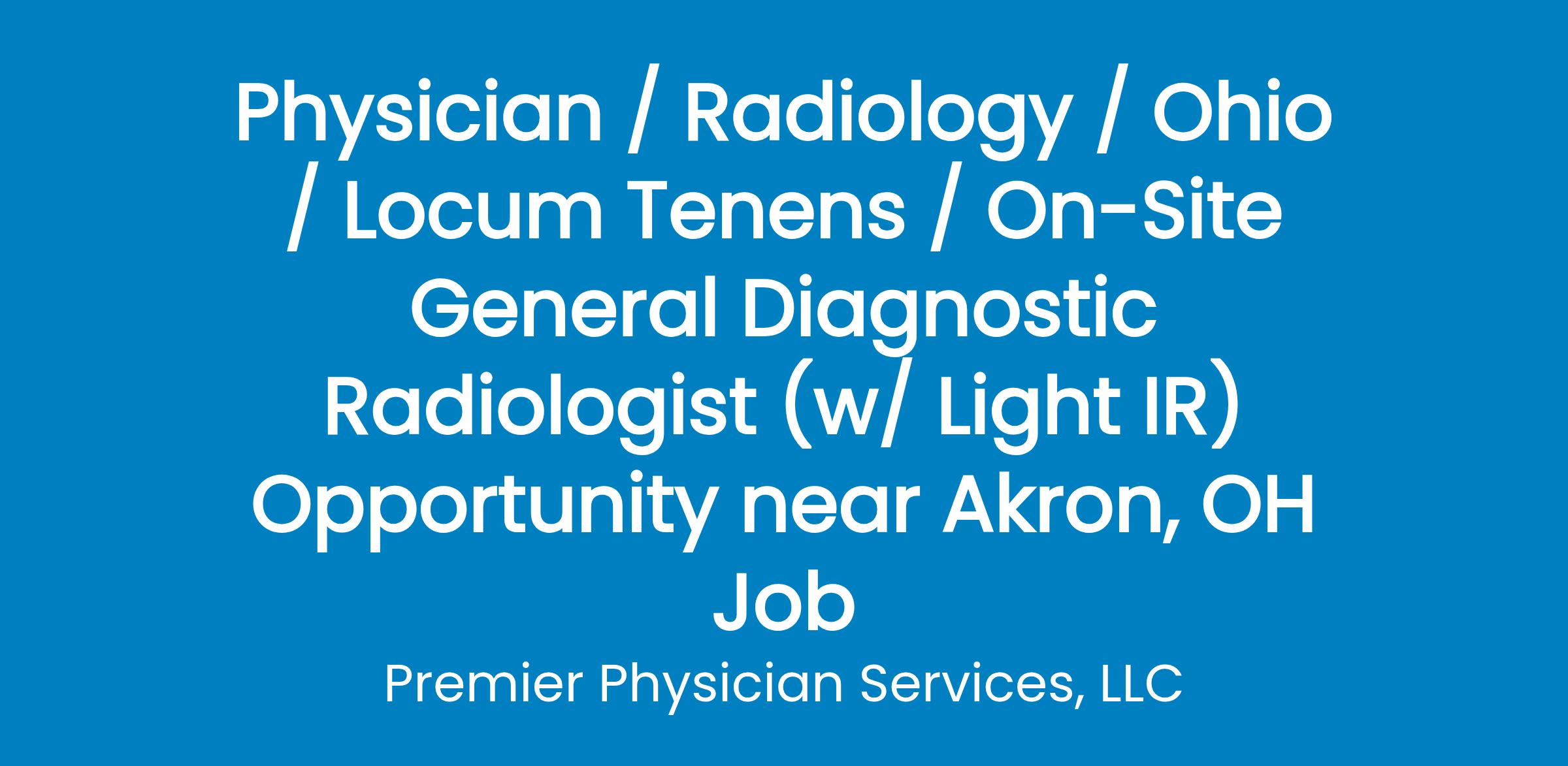 Premier Physicians is seeking an on-site General Diagnostic Radiologist with expertise in light interventional radiology for a locum tenens opportunity starting January 2025 and continuing on an ongoing basis. This position is conveniently located just a short drive from Akron, OhioKey Details:- Shift Schedule: MondayFriday (8a-5p)- Job Details: 90100 reads per 8-hour shift (mixed modalities) or 6070 wRVUs.Requirements:- Active medical license & DEA- Board Certification- Clean backgroundFor additional details on this opportunity or others, please contact Carly Kairis at or . If this position isnt the right fit, we have a variety of other opportunities available and would love to help you find the right match.Join us in providing outstanding care while enjoying the flexibility and rewards of a locum tenens role!