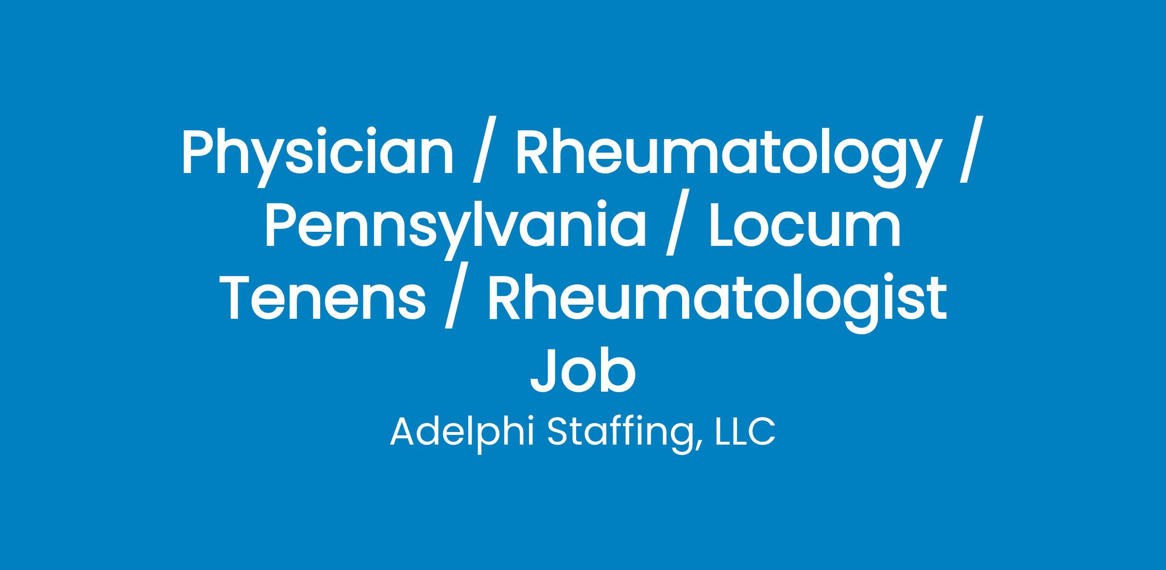 JOB OVERVIEW Job Title: Physician Rheumatology Job Type: Locum Tenens (Full-Time) Location: Hanover, PA Service Setting: Outpatient clinic with limited hospital consults Coverage Type: Clinical + APP Supervision Coverage Period: Starting January 2, 2026 Ongoing Clinical Shift Schedule: MondayFriday, 8:00 AM 4:30 PM Coverage Details: 20 shifts/month (can be split between 2 providers, 10 each) Reason for Coverage: Supplemental Support Staff Available: 2 PAs (APPs) supervision required; RN & MA support EMR System: EpicPATIENT INFORMATION Patient Demographics: Adults only Outpatient Volume: 1216 per day (36 patient-facing hours/week) Hospital Consults: 05 per month (phone consults during office hours) Case Mix: Rheumatoid Arthritis, Psoriatic Arthritis, Ankylosing Spondylitis Lupus, Scleroderma, Sjogrens Syndrome Gout, Osteoporosis, Vasculitis, Myopathies GCA, Temporal Arteritis, PMR, Sarcoidosis Reactive Arthritis, Raynauds Phenomenon, Wegeners Granulomatosis, Polyarteritis Nodosa Positive ANA with systemic features (rash, joint swelling, pain, pleural effusion, pericarditis) Procedures: Joint injectionsPRIVILEGES & COMPLIANCE Hospital Privileges Required: Yes Credentialing Timeline: 90 days Licensure: Active Pennsylvania medical license (IMLC accepted) DEA: Required Certifications: BLS Board Status: BC/BE in Rheumatology Experience: Minimum 1 year Travel: Mileage, airfare, lodging, rental car