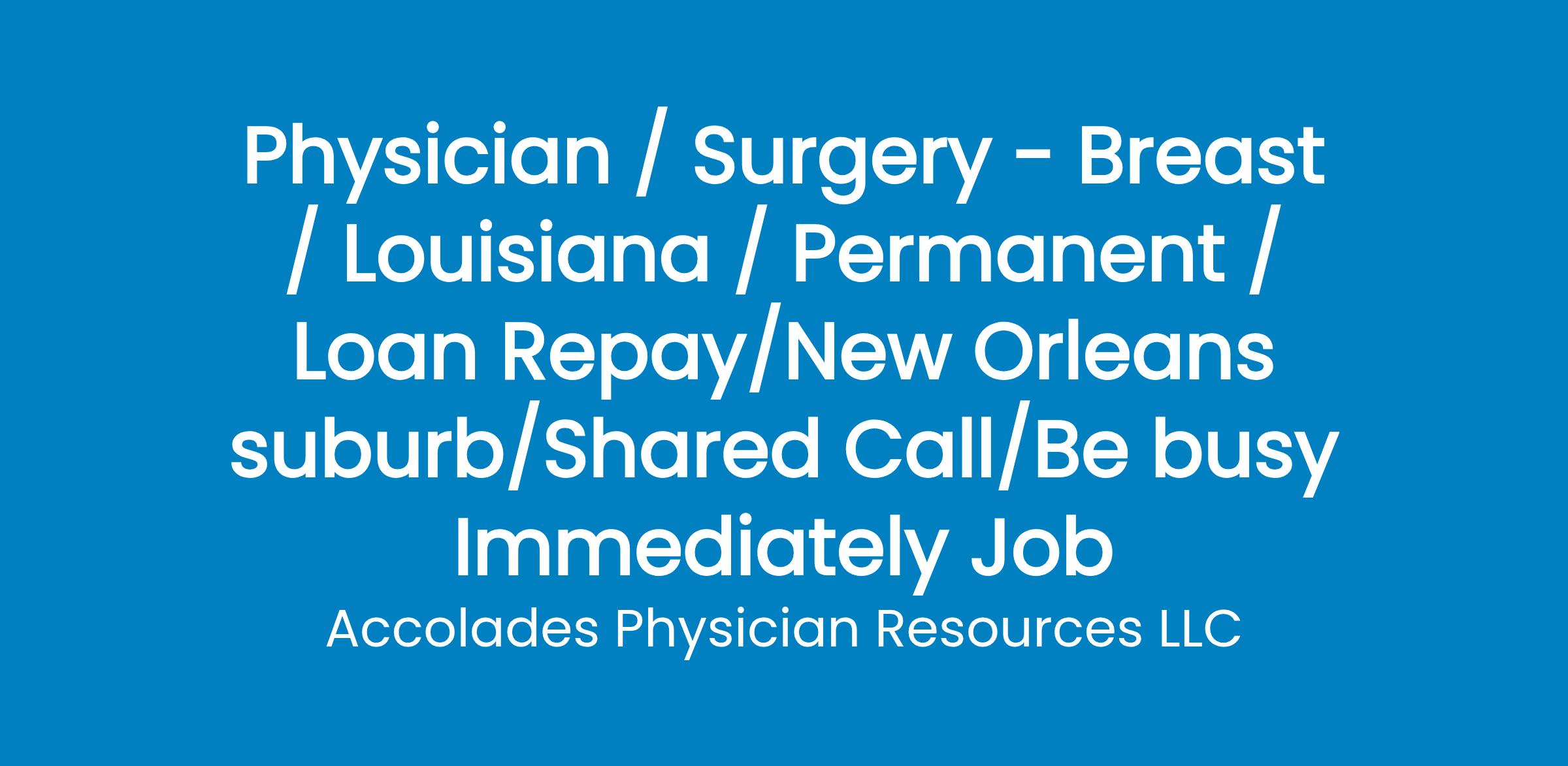COMMUNITYBlue ribbon schools and great place to raise a family. Short drive (less than 1 hour) to great entertainment, fine dining, music, sports & international airport in New Orleans. The North Shore area offers friendly neighborhood living options.OVERVIEWExtremely stable, well managed regional health system with a certified stroke center as well as a robust hospitalist/nocturnist program has been rewarded with over 15 years of A+ Leapfrog scores. 30 bed ICU.ROLEWill see patients in a traditional, inpatient & outpatient, practice settingJoin surgical department with its own state of the art facilitiesMulti-disciplinary Womens Health Clinic treats malignant & benign casesBe busy immediately for Breast SurgeryEnjoy referrals from over 100 primary care physiciansLow physician attrition rateEMR EpicPACKAGETotal earnings year 1 can reach above MGMA median levelsSalary Range Commensurate with experienceStudent Loan ProgramEligible for Federal Loan Forgiveness$10,000 Relocation reimbursementFull benefits package