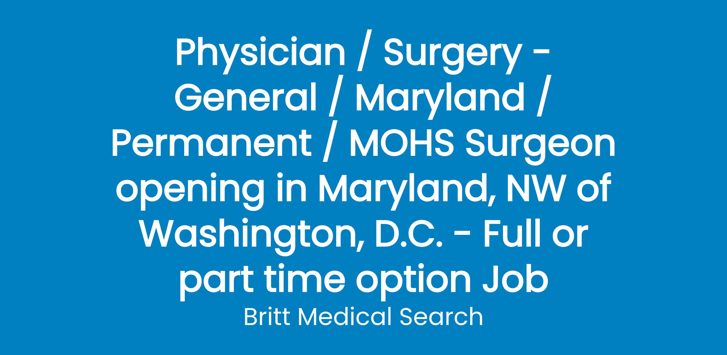 Seeking a BC/BE MOHS Surgeon to join a full-service general dermatology, surgical, and cosmetics practice in Maryland, northwest of Washington, D.C.