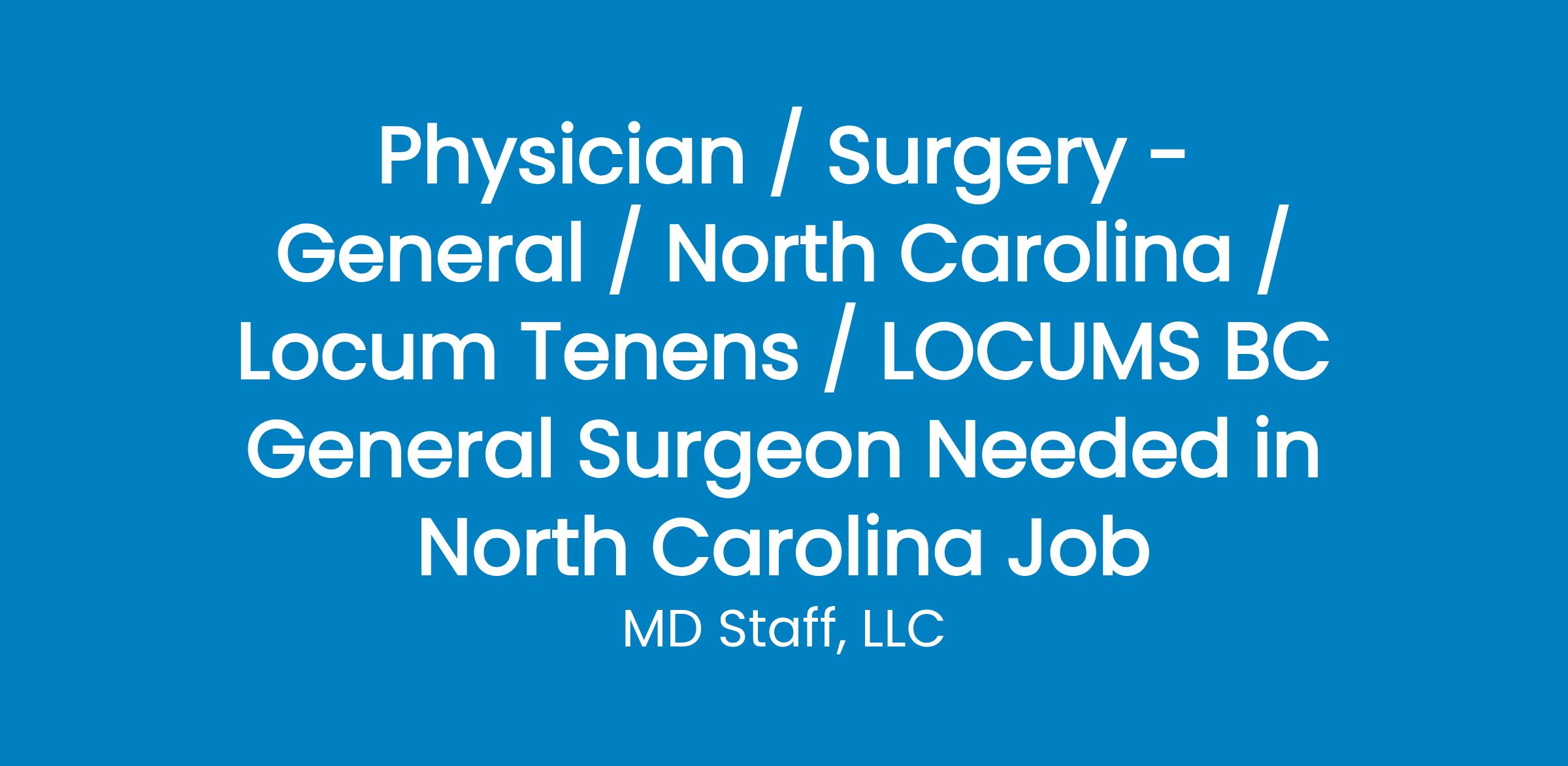 Locum Tenens General Surgeon Opportunity in a Charming Southeastern State Are you a Board Certified General Surgeon seeking a locum tenens opportunity in a picturesque southeastern state? We have a temporary position available, and we invite you to join our team in providing coverage at a well-regarded healthcare facility in North Carolina. Job Details: Specialty: General Surgery Candidate Type: MD, DO Visa Accepted: No J-1 or H-1B Salary Range: Not Specified Loan Repayment: Not Specified Employment Type: Locum Tenens Bonuses Offered: None The average number of patients seen per provider per day is 7-8, with 1-2 admissions per day and 1-2 admissions at night. Expect approximately 50 surgical cases per month. You will not be responsible for responding to codes or serving as backup in the ER. Procedures required for this position include appendectomy, strangulated hernias, cholecystectomy, I&Ds, and procedures that will be emergencies. Additional Information: Electronic Medical Record (EMR): EPIC (HealthSpan) Conveniently located near the charming town of Littleton, NC If this locum tenens General Surgeon opportunity in North Carolina, interests you, please reach out to us for more information. For inquiries, you can call or text MD Staff at or contact us via email at . Please reference Job ID . Join our team and experience the rewarding environment in this southeastern state!