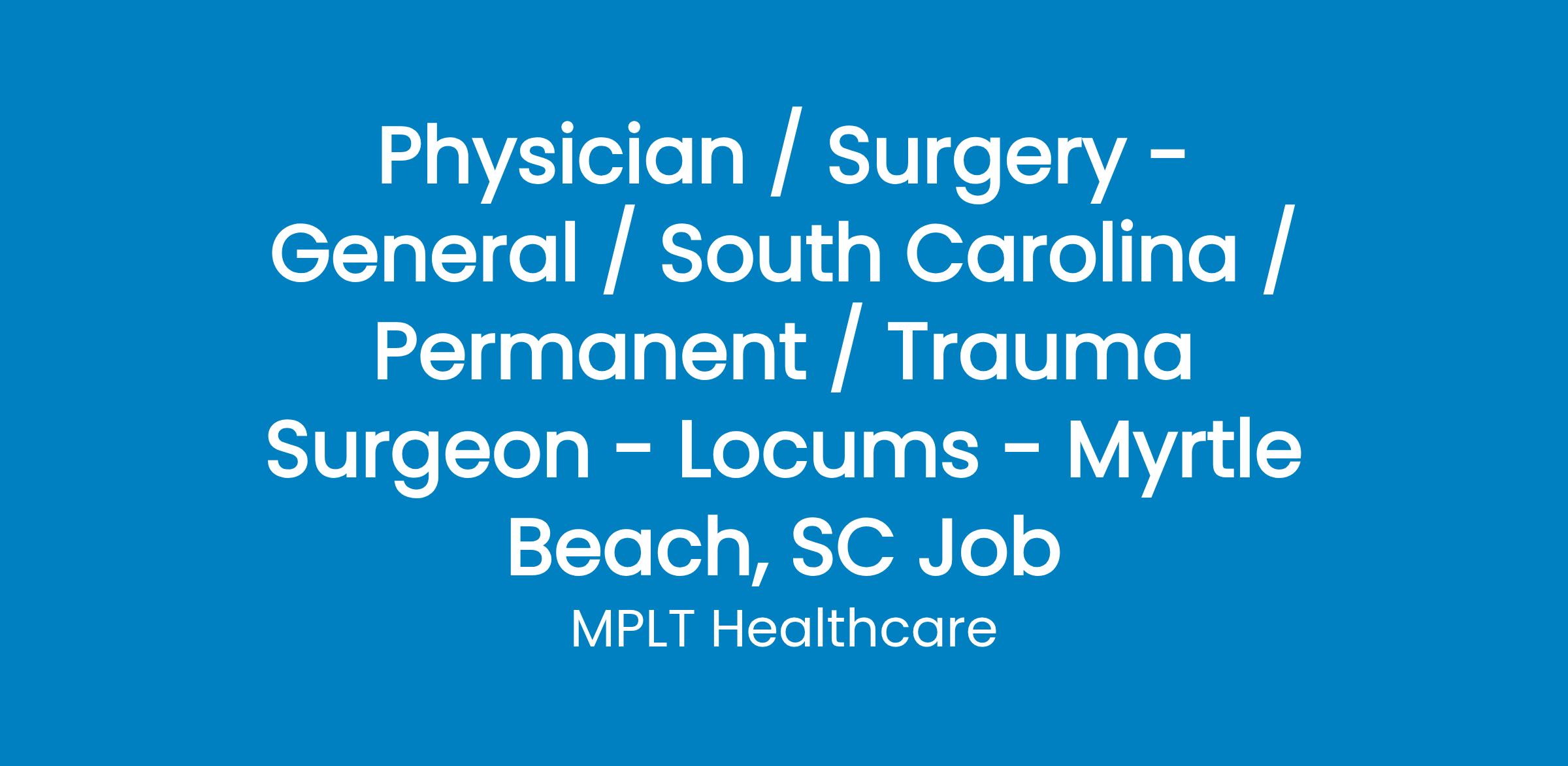 MPLT Healthcare is looking for physicians who Understand the Urgency, Never Give Up, and Have the Courage to Excel in the forever changing medical industry! We have numerous opportunities for an experienced Trauma Surgeon with highly competitive pay rates in Myrtle Beach, SC.