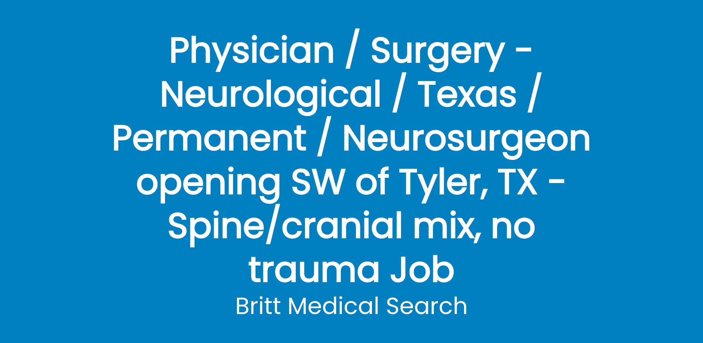 Medical center is seeking a BE/BC Neurosurgeon with an interest in spine/cranial work to join their team southwest of Tyler, Texas.