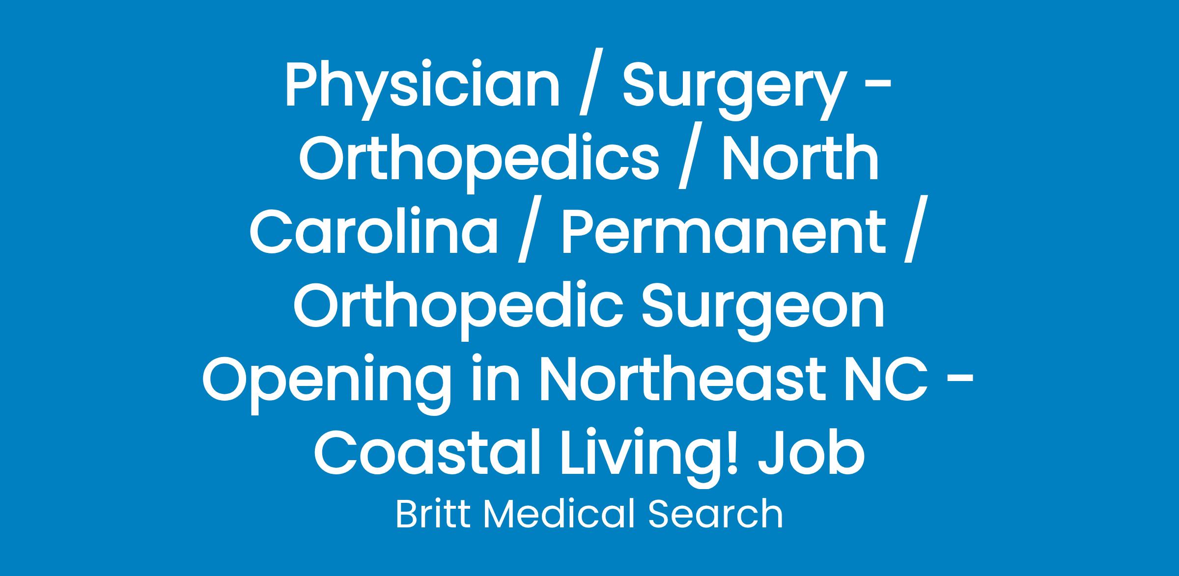 Physician / Surgery - Orthopedics / North Carolina / Permanent / Orthopedic Surgeon Opening in Northeast NC - Coastal Living! Job