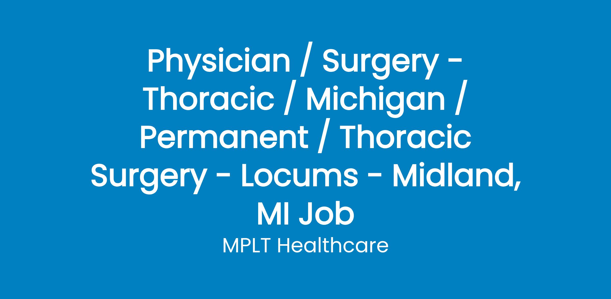 MPLT Healthcare is looking for a physician who Understand the Urgency, Never Give Up, and Have the Courage to Excel in the forever changing medical industry! We have numerous opportunities for an experienced Thoracic Surgeon with highly competitive pay rates in Midland, MI .