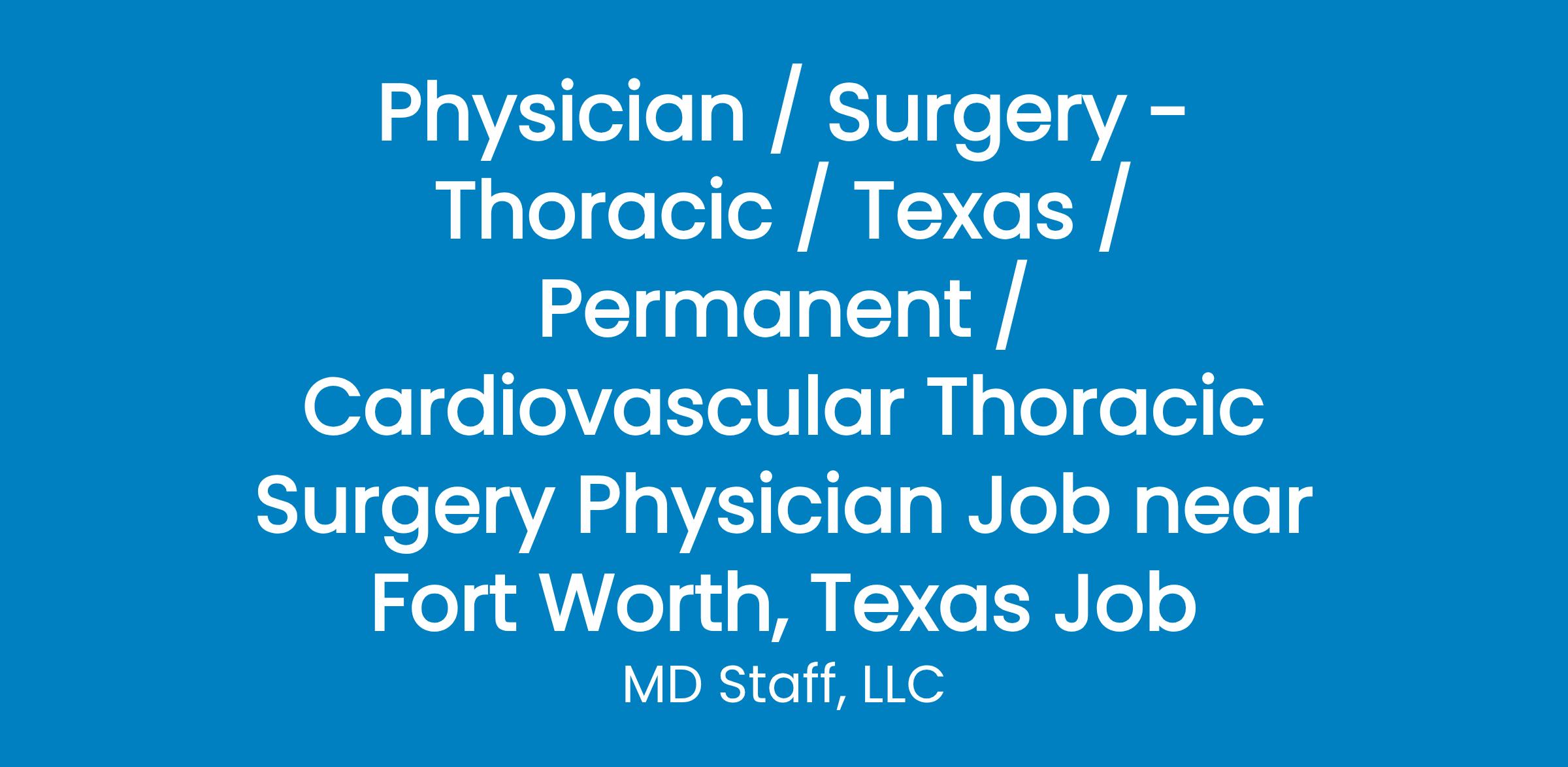 Cardiovascular Thoracic Surgeon Physician Job near Fort Worth, TX A BC/BE Cardiovascular Thoracic Surgeon is needed to practice at the largest regional medical center in Midwest Texas. Practicing and experienced physicians as well as fellows will be considered. Must be licensed in Texas or eligible. The center has two new hybrid ORs and dedicated CV ORs to fully perform wherein physicians can perform full range adult cardiac, vascular and thoracic procedures. Call will be shared with 2 other Cardiovascular Thoracic Surgeons. # J-6042. If you are interested in hearing more about this opportunity, please call HDA at , or text to . You can also reach us through email at . Please reference Job ID # j-6042
