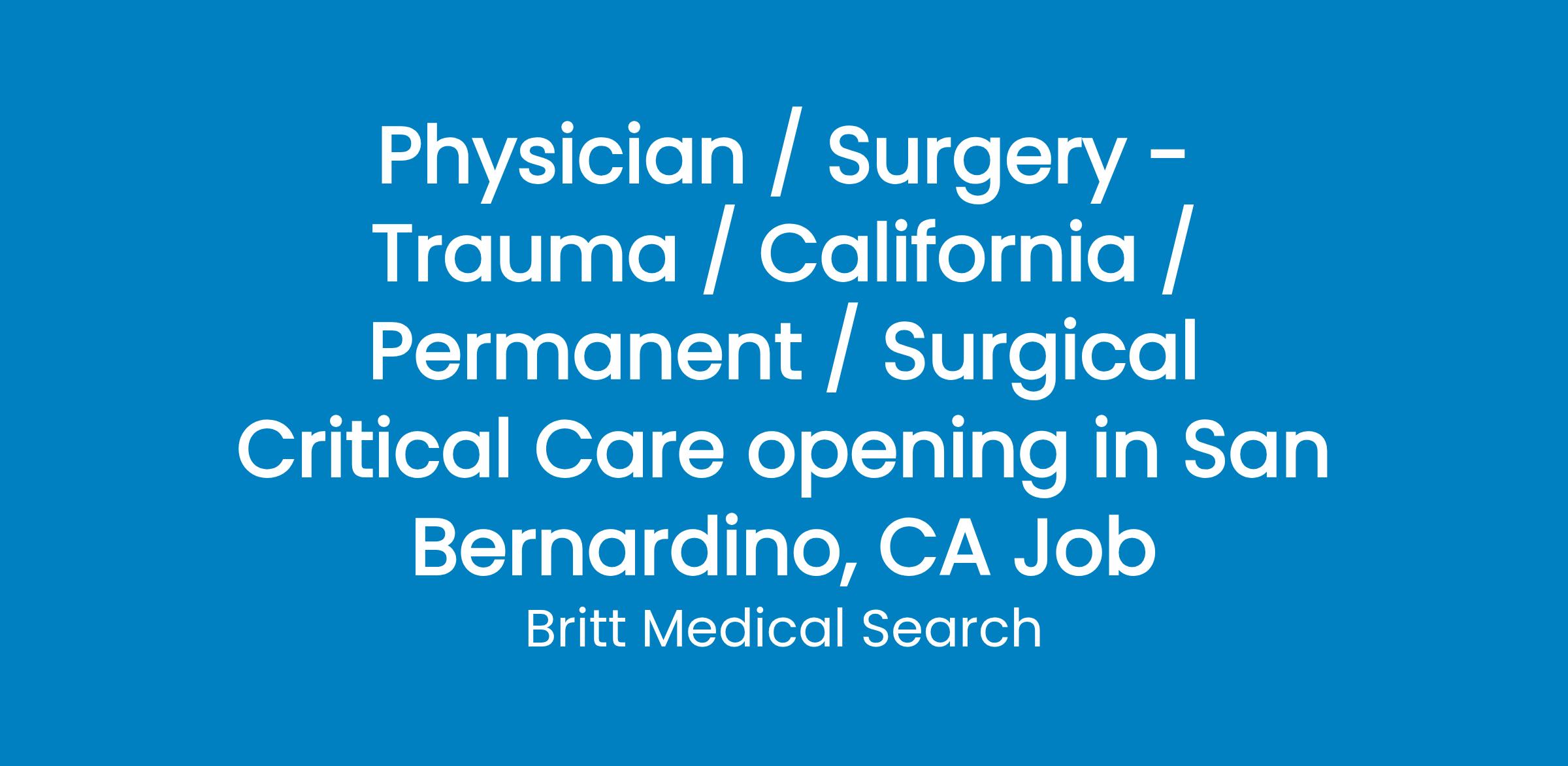 Surgical Critical Care position with elective General Surgery cases and call joining a well established 35+ physician surgical private practice in the Los Angeles Inland Empire Area with (1) Surgical Critical Care physician and (5) General Surgeons associated with a 400 bed hospital. Academic appointment with medical school and future General Surgery training program. 1-5 call. Surgical Critical Care Fellowship required.