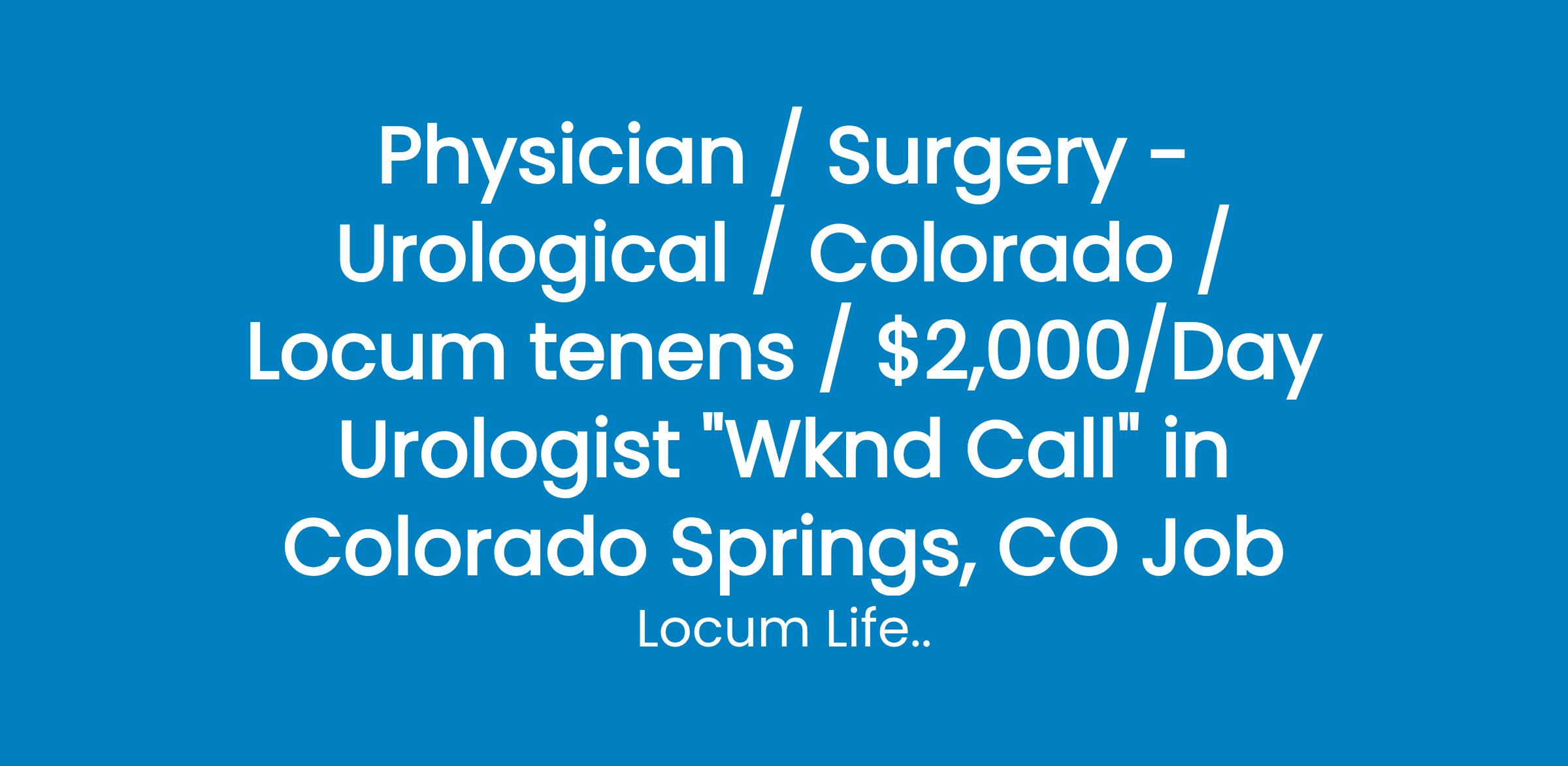 Physician / Surgery - Urological / Colorado / Locum tenens / $2,000/Day Urologist "Wknd Call" in Colorado Springs, CO Job