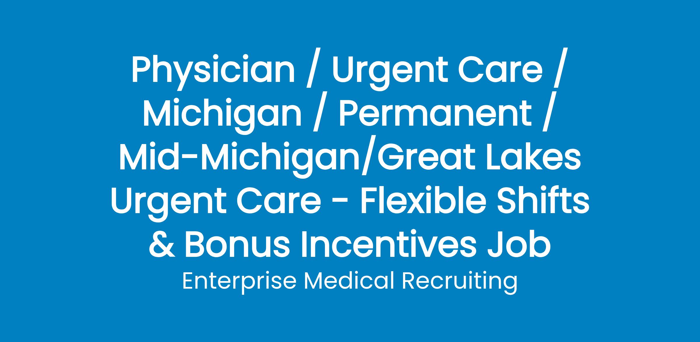 A hospital-employed network located in the Great Lakes Bay region of Michigan is searching for BC/BE physicians (Internal Medicine, Family Medicine, Emergency Medicine) to work in an Urgent Care setting with an established support team.