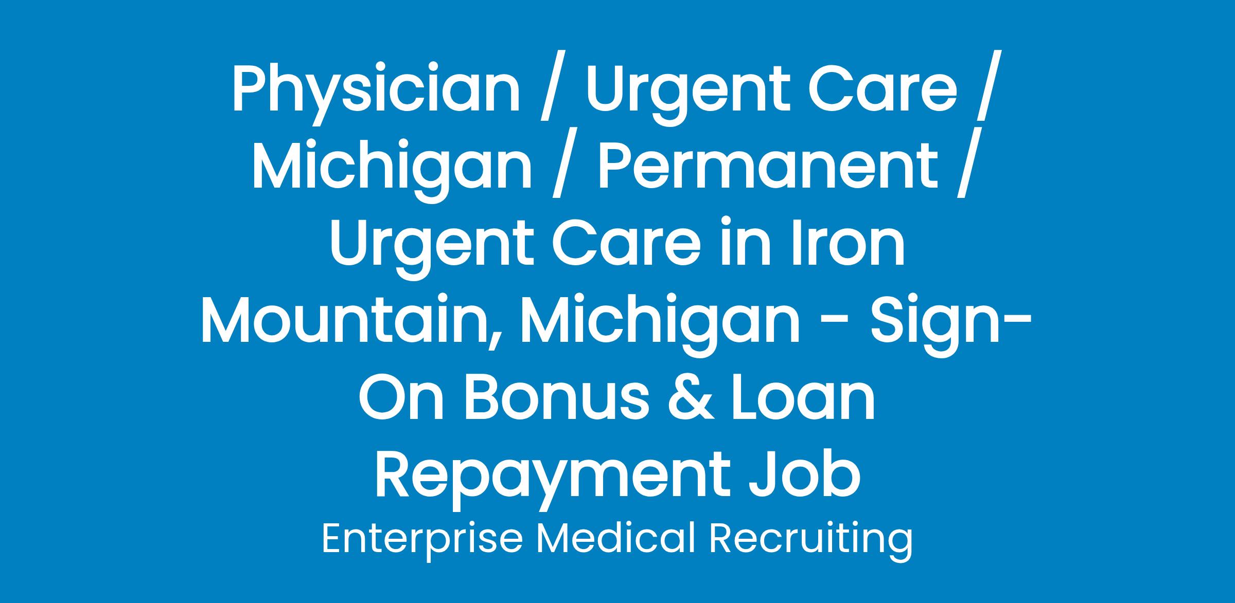 Healthcare System is seeking a Board Certified Family Medicine MD/DO to join a group of three experienced Advanced Practice Clinicians in a busy Upper Peninsula of Michigan Urgent Care in Iron Mountain, Michigan.