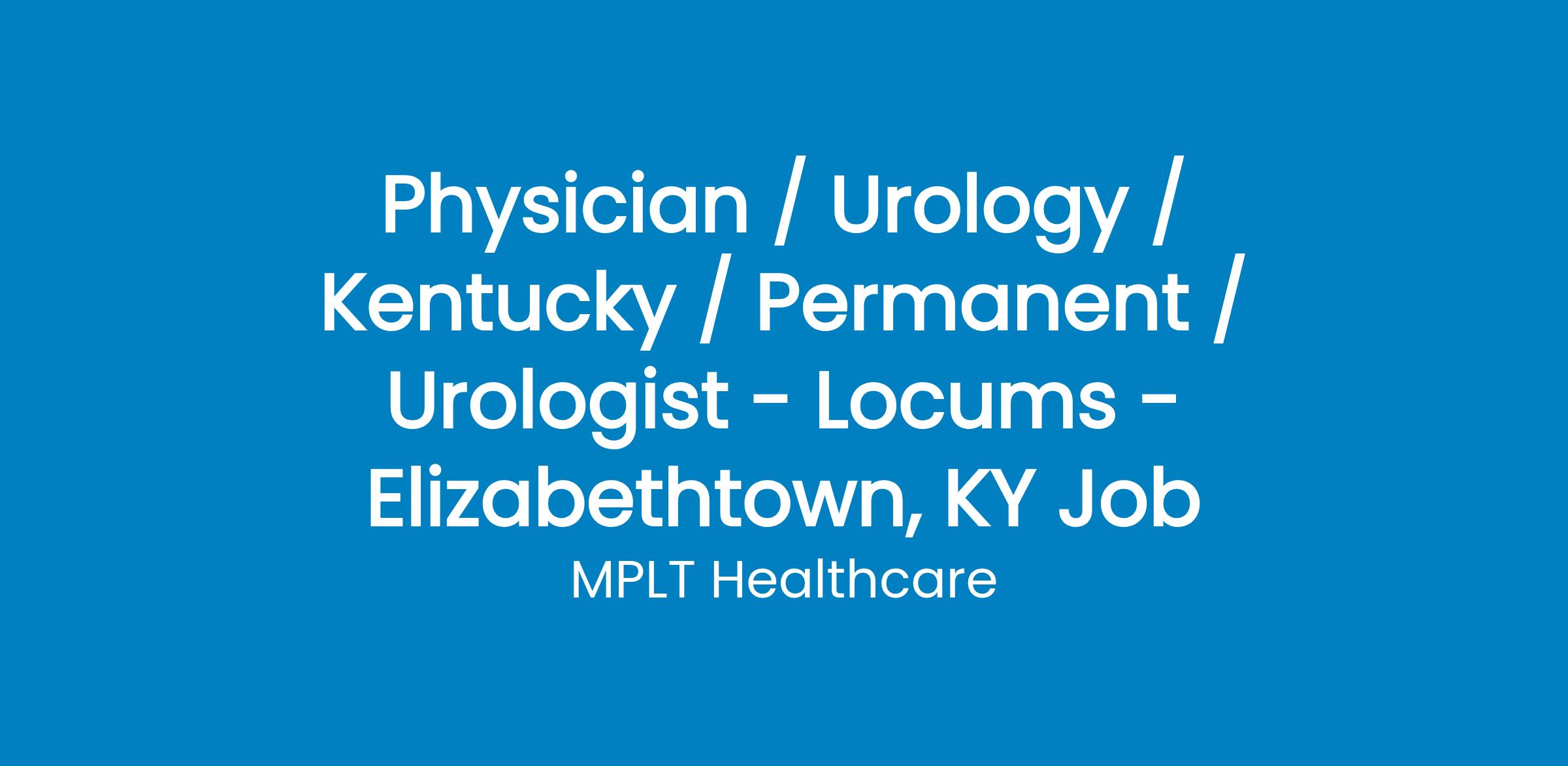 MPLT Healthcare is looking for physicians who Understand the Urgency, Never Give Up, and Have the Courage to Excel in the forever changing medical industry! We have numerous opportunities for an experienced Urologist with highly competitive pay rates in Elizabethtown, KY .
