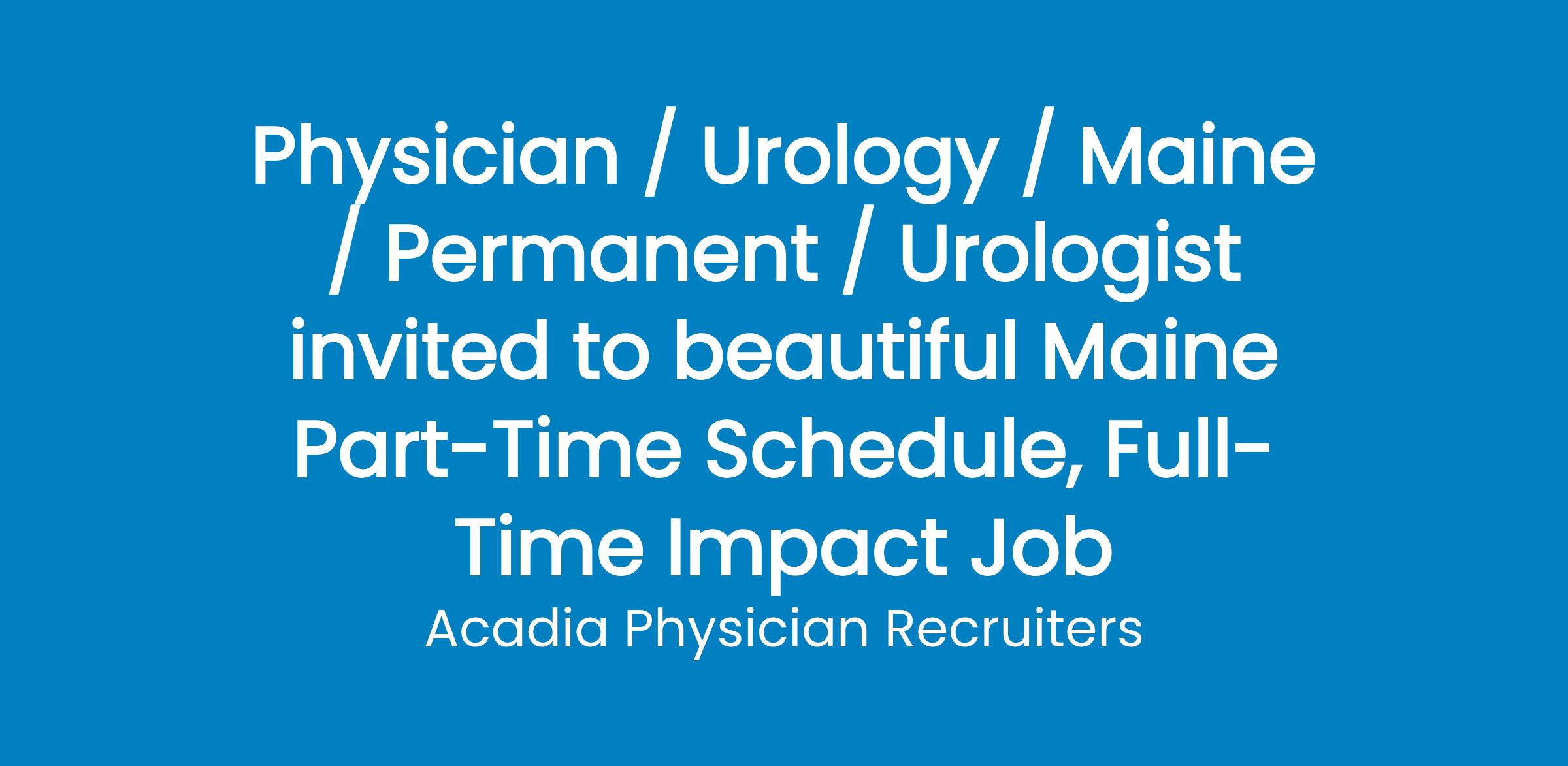 Houlton, Maine: A respected critical access hospital in scenic Aroostook County invites a skilled Urologist to join their well-established surgical team in a flexible part-time position offering excellent work/life balance and a meaningful community impact. This hospital-employed role is ideal for a physician approaching retirement who still enjoys practicing, without the pace or pressure of full-time work.Enjoy a convenient schedule of two-week blocks, alternating two weeks on/two weeks off, for a total of 26 weeks of coverage annually. This role is designed to support continuity of care for patients while providing incredible personal flexibility for the practitioner. You will provide an interesting mix of outpatient and surgical services and procedures including such things as cystoscopy, laser lithotripsy, stent removal, vasectomy, urolift, biopsies, dilation, transrectal ultrasound, and more. Join a stable, supportive medical center with strong clinical and administrative backing.Step into an autonomous practice without night, weekend, or holiday responsibilities. This is a wonderful opportunity to serve a grateful patient population while enjoying a generous amount of time off, and a peaceful pace of life in beautiful northern Maine.You will earn a competitive salary based on your experience and this schedule. Benefits include relocation assistance, liability insurance, health and dental benefits, and support for your professional needs. Details will be shared with qualified candidates.Live Where Others Vacation: Maine ranks in Best Quality of Life and Safest State in the U.S. Known as Vacationland, the state offers year-round recreation including boating, fishing, hiking in Acadia National Park, and skiing at premier resorts. Maines vibrant arts scene, cultural festivals, and local food movement enhance its appeal. With a strong sense of community and a slower pace of life, Maine is ideal for those seeking natural beauty and balance.Houlton is a safe, welcoming town near the Canadian border with excellent schools, affordable housing, and a close-knit atmosphere. Residents enjoy easy access to four-season outdoor recreation, including lakes, trails, forests, and snow sports. Many visit Fredericton, New Brunswick (population 100,000+), just 75 miles east. Houlton is one hour from Presque Isle (with daily flights to Boston), and two hours from Bangor, home to an international airport, shopping malls, entertainment venues, and more. Portland is 3.5 hours away, and Quebec City is just 5 hours from Houlton.If you are ready for a low-stress, high-reward clinical role in a community that truly values its physicians, lets talk!Position Highlights: Part-time hospital-employed Urologist role in scenic northern MaineMaine ranks in Quality of Life and Safest StateFlexible 2-weeks-on/2-weeks-off schedule practice just 26 weeks/yearEnjoy an incredible work/life balance in a desirable communityMix of office-based and surgical proceduresNo nights, no weekends, no holidays, no callPerform cystoscopy, laser lithotripsy, vasectomy, urolift, and moreWork with a supportive team in a respected critical access hospitalAutonomous practice with strong administrative backingCompetitive salary with benefits aligned to a part-time schedulePaid relocation assistance plus liability and health coverageSafe, welcoming, affordable community near Canadian borderEnjoy 4-season recreation, vibrant arts scene, and natural beauty