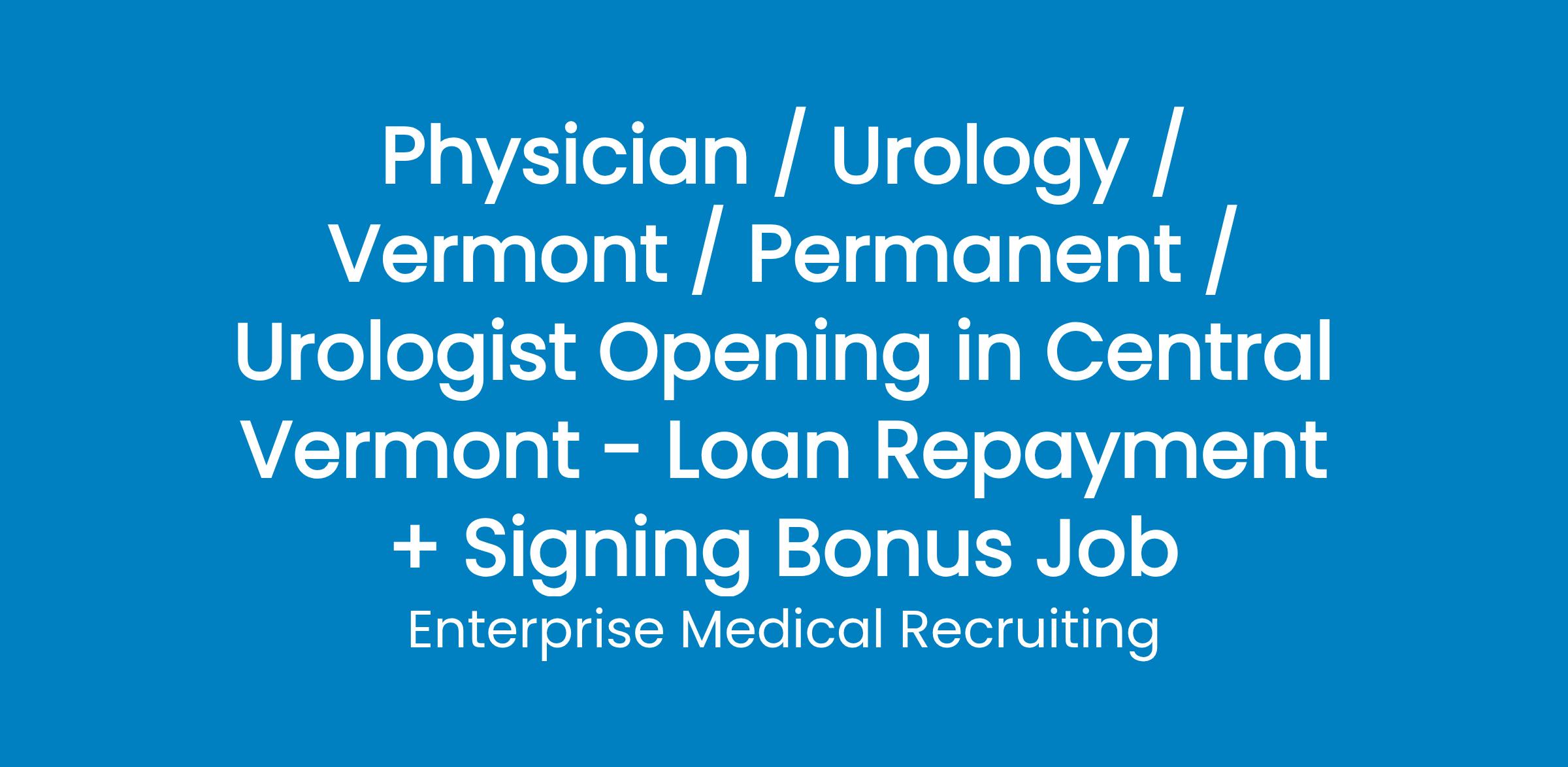 An award-winning, independent, 144-bed community hospital that servescentral and southern Vermont and eastern New York State is adding a Urologist. They are the second largest hospital in Vermont, with a largeservice area and an emergency department with 32,000 annual patient visits.